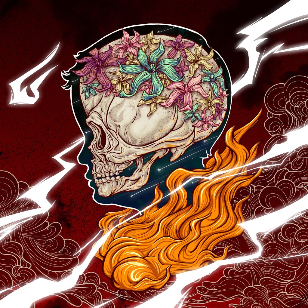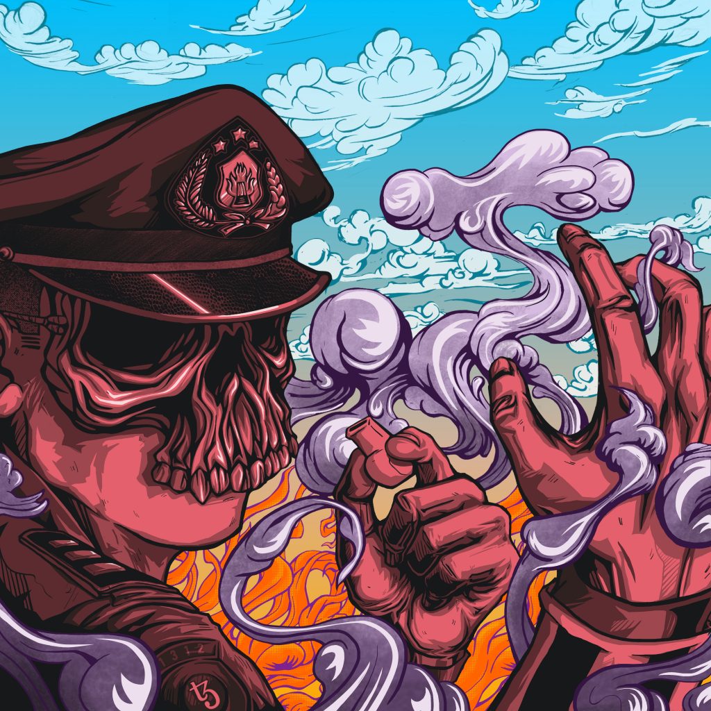 Later then, I create a digital work based on my visual character that I usually presented on printmaking work. This first NFT artwork is a digital version of Act of Terror from Bhayangkara series that I was made by reduction woodcut print technique on paper. On this work I try some possibilities that can be reached by the advanced of digital technologies. Varieties of color, light effect, and motion are several aspects I added while creating this work to make a diverse character with the conventional print work.