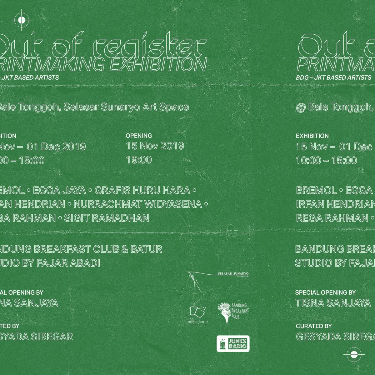 What are the recent printmaking practices by Bandungite and Jakartan young artists? Out of Register then comes a meeting point of seven works made by two collectives from Jakarta and five artists from Bandung. This exhibition inscribes what kind of shifts of printmaking practice outlined by these artists; based on the prime techniques of intaglio, screenprints, woodcuts, to the offset printing and the performative act of printmaking itself. Out of register, a printing phenomenon that caused misaligned lines and colors on prints is the title to showcase the interchanges of artists from these warm and cold regions - offering us to inspect the results of formulated steps versus improvisational tactic in order to adapt on-field challenges.